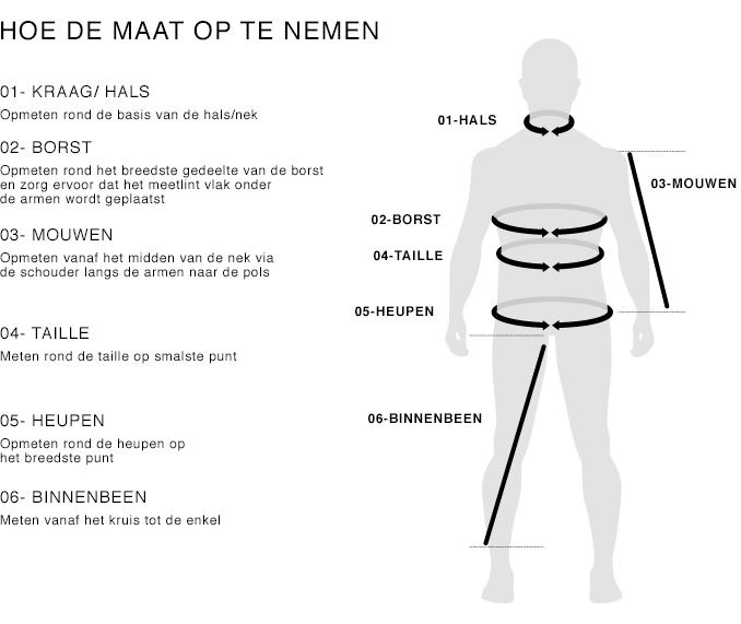 MAAT    LENGTE (cm) BORST (cm) MOUWLENGTE (cm) TAILLE (cm) HEUP (cm) BINNENBEEN (cm - van binnenbeen tot enkel)